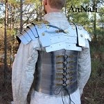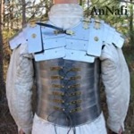- he cuirass is tied shut front and back with leather thongs. The upper body and shoulders are protected by additional shoulder guards. The shoulder guard (Pauldron) is well decorated with polished brass hinges and rivets.